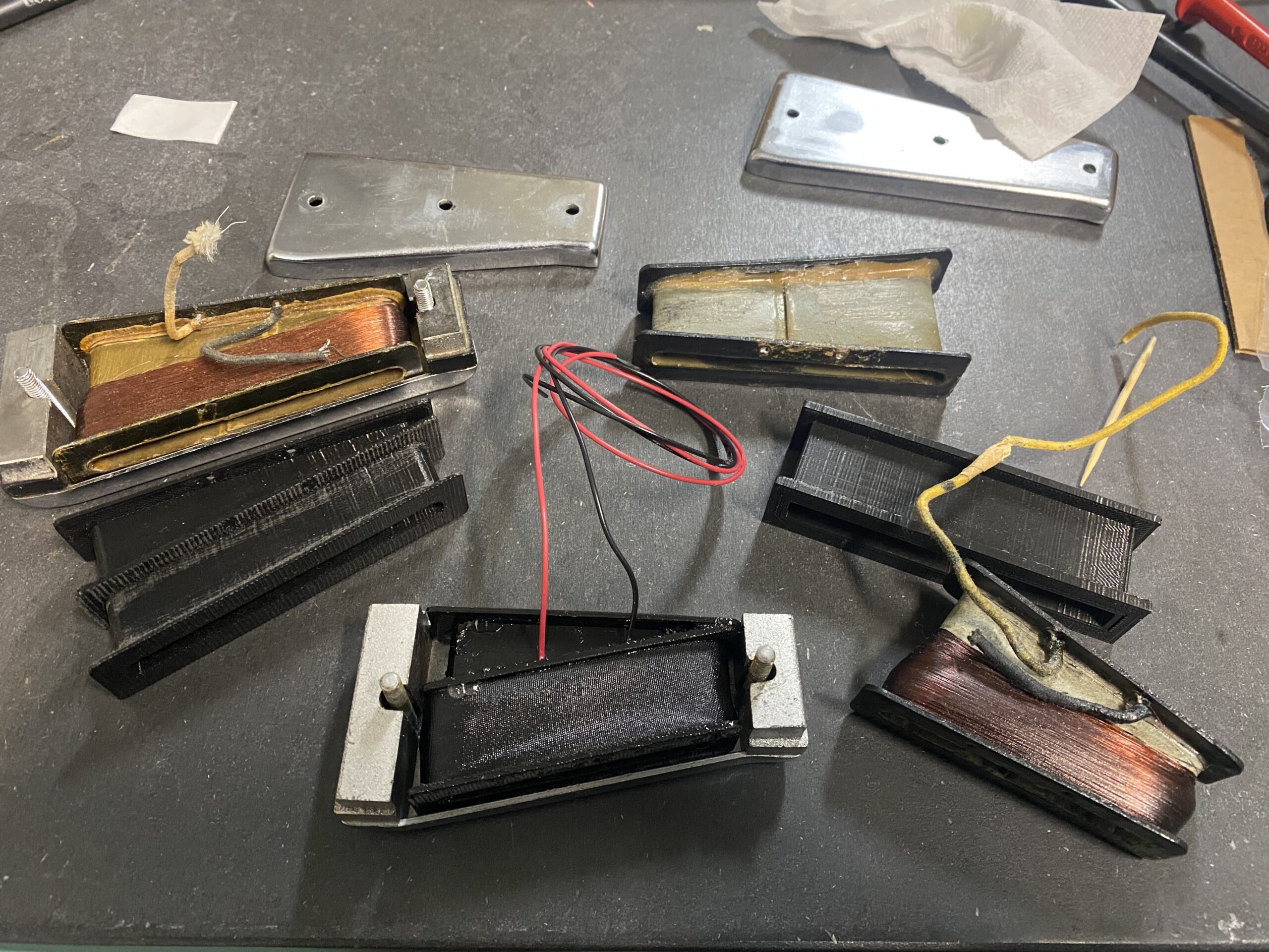 The vintage Trap pickups are revered for their unique tone, but have long been problematic and known to fail over time. Nick Fryer has reverse-engineered these pickups and has created an all-new modern bobbin to replace the old bobbin in these pickups. The bobbins and wound to 12.5K. Ideally, you send me the entire pickup unit, and I will recharge the magnets and install the new bobbins.